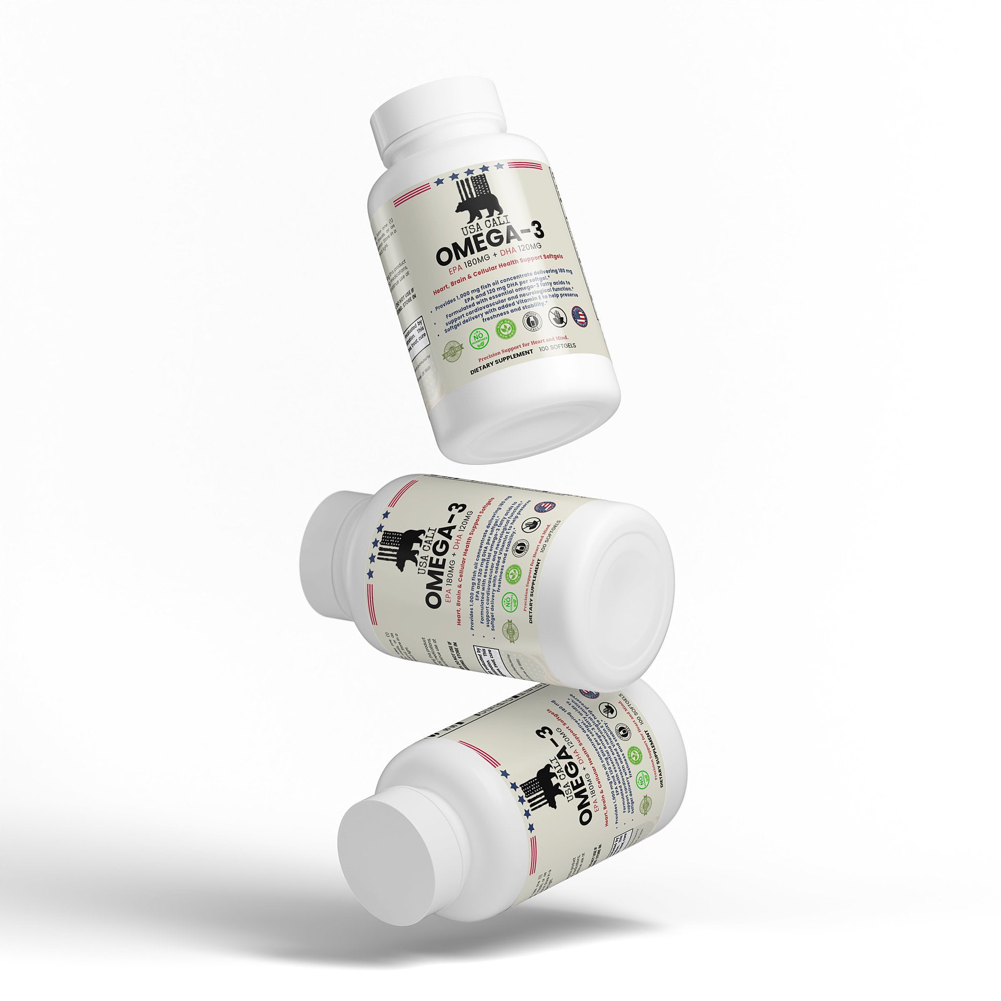 Nourish your heart, brain, and whole body with USA CALI Omega-3 Fish Oil Softgels – a premium, precisely dosed marine omega-3 formula delivering EPA 180mg and DHA 120mg per softgel from purified fish oil concentrate, with Vitamin E for antioxidant freshness protection. Trusted by health-conscious individuals worldwide, omega-3 fatty acids represent one of the most extensively researched nutritional compounds for comprehensive cardiovascular and neurological wellness.
